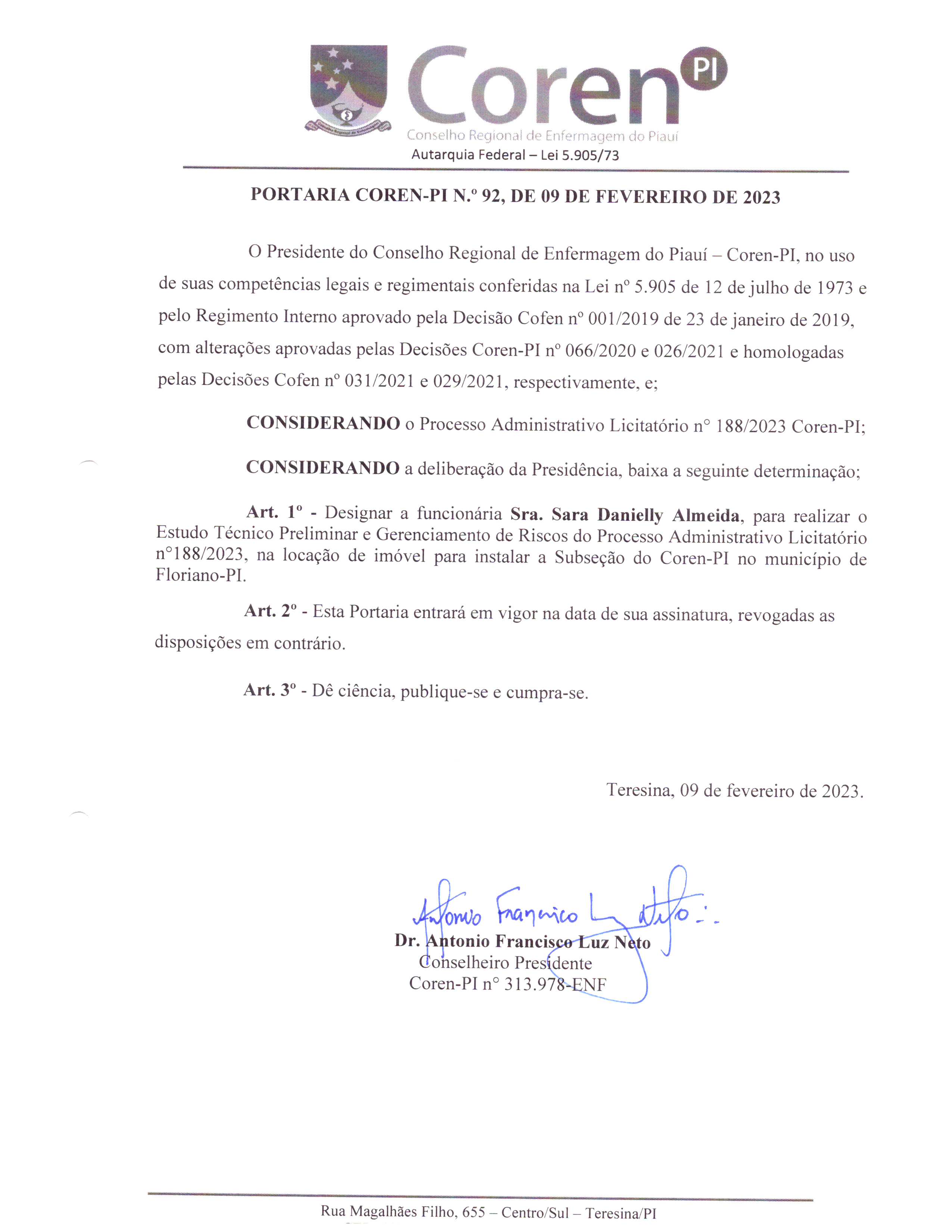 Exoneração da Procuradora Jurídica do Coren-PI.